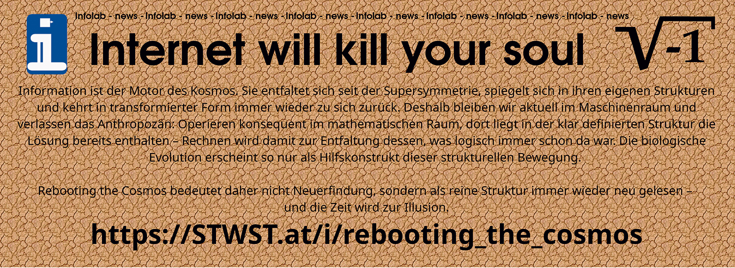 Information ist der Motor des Kosmos. Sie entfaltet sich seit der Supersymmetrie, spiegelt sich inihren eigenen Strukturen und kehrt in transformierter Form immer wieder zu sich zurück. Deshalb bleiben wir aktuell im Maschinenraum und verlassen das Anthropozän: Operieren kensequent im mathematischen Raum, dort liegt in der klar definierten Struktur die Lösung bereits enthalten - Rechnen wird zur Entfaltung dessen, was logisch immer schon da war. Die biologische Evolution erscheint so nur als Hilfskonstrukt dieser strukturellen Bewegung.